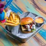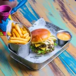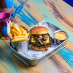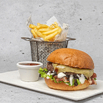 Wagyu beef patties, crispy bacon, fried onions, jalapeño, house sauce, spicy mayo, a brioche bun and French fries.