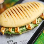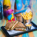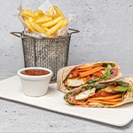 Grilled chicken and mashed avocado with sun-dried tomato, rocket leaves and honey mustard sauce in panini bread. Served with French fries.