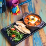 Middle Eastern spiced tomatoes with eggs, served with pita bread or paratha.