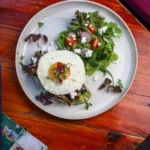 Fried egg, mashed avocado, wild mushrooms, mixed salad and feta cheese on multigrain bread.