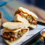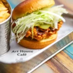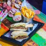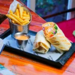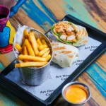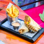 Pulled roasted brisket, quinoa, sliced avocado, cheddar cheese, mixed leaves, red kidney beans, smoked paprika, house sauce, in tortilla wrap. Served with French fries.