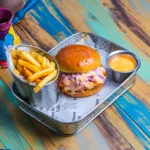Homemade classic roast beef with house pickles, fresh rocket, caramelised onion, cheese, horseradish sauce on sourdough bread with French fries.