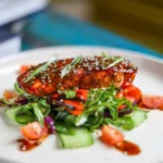 Grilled salmon glazed with teriyaki sauce, braised cabbage, bok choy, snow peas, cucumber, red capsicum, spring onion, sesame seeds, rocket leaves and coriander, with a lime and soy dressing.