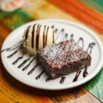 A warm, fudgy brownie served with a scoop of creamy vanilla ice cream.