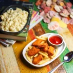Six pieces of chicken coated in crispy breadcrumbs. Served with French fries.
