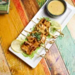 Thai-style grilled chicken skewers served with peanut coconut sauce.
