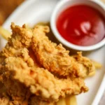 Five tender breaded chicken strips, perfectly cooked. Served with French fries.