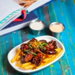 Fried wings tossed in your choice of sauce (smoked barbecue, buffalo sauce), French fries and ranch sauce.