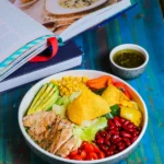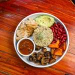 Juicy grilled chicken served on a hearty brown rice base, topped with beans, roasted sweet potatoes, sliced avocado and a rich mushroom sauce.