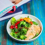 Grilled chicken, kale, avocado, cucumber, capsicum, baby radish, blueberries, parsley, mint, white onion jam with honey lime dressing.