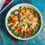 Warm grilled prawns, kale, quinoa, avocado, cherry tomatoes, with paprika, orange and cilantro dressing.