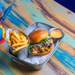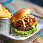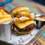 Grilled wagyu beef patty with cheese, crispy bacon, lettuce, honey barbecue, garlic aioli sauce, a brioche bun and French fries.