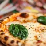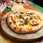 A vibrant blend of homemade tomato sauce, melted mozzarella and oregano, topped with fresh mushrooms, bell peppers, onions, and olives, creating a flavour-packed plant-based neapolitan pizza.