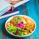 Juicy shish tawouk chicken, grilled halloumi, freekeh, roasted baby potatoes, tomato and cucumber salad, creamy purple hummus and pomegranate.