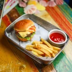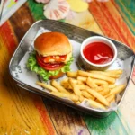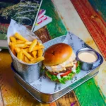 Vegan meat patty with lettuce, onion, tomato, aioli and house sauce on brioche bun with French fries.