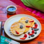 Three pieces of pancakes served with fresh berries and maple syrup or honey.