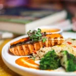 Pan-seared salmon fillet served with coconut brown rice (or jasmine rice), steamed broccoli, asparagus, and a fragrant Thai-flavored sauce.