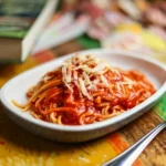 Aromatic tomato sauce spaghetti generously sprinkled with cheese.