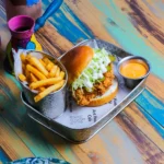 Cayenne fried chicken tossed with Louisiana hot sauce, wholegrain mustard coleslaw, a brioche bun and French fries.