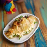 Two pieces of pistachio-stuffed pancakes, served with maple syrup or honey.