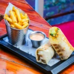 Crispy tempura shrimp tossed in dynamite sacue, cabbage, tomato, coriander, spring onion, spicy mayo in tortilla bread. Served with French fries.