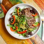 Roasted beef and zoodle on a bed of mixed leaves, red capsicum, red radish, spring onion, and sprinkles of sesame seeds and crunchy tortilla with wholegrain mustard dressing.
